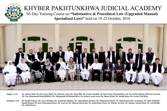 The Academy conducted the third specialized 05-Day Training on “Substantive and Procedural Laws” for newly promoted Additional District and Session Judges/Izafi Zilla Qazis across the province. The training commenced on 18th October, 2016 that continued till 22nd October. The focus of the training was on Illegal Dispossession Act, Dishonoring of cheque u/s 489-F Pakistan Penal Code & Justice of Peace (Section 22-A of Criminal Procedure Code). The recent judgments of the august Supreme Court of Pakistan on the limits and parameters of illegal dispossession were specially focused. A comparison between previous judgments of the apex court on the subject and its recent judgments was made in a participatory way. The training was formally concluded by the Director General KPJA, Mr. Zia uddin Khattak. In his closing remarks, the worthy DGlauded the behavior of the participants during the whole session. He saw off the participants with thanks and a piece of advice.