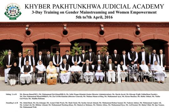 A 03 day training comprising a batch of 25 male and female Civil Judges/Judicial Magistrate on Gender Mainstreaming and Women Empowerment was conducted at the Academy. The training was organized in collaboration with the Aurat Foundation Pakistan, Peshawar office and UNDP. This was in continuation of training on women rights held last year. The topics of the sessions included Violence against women and legal protection, Judicial verdicts, International Instruments, National Legislation and Women rights to inheritance and its implementation. The training concluded on 7th April. On the occasion of the concluding ceremony, Mr. Zia ud Din Khattak awarded certificates to the participants.