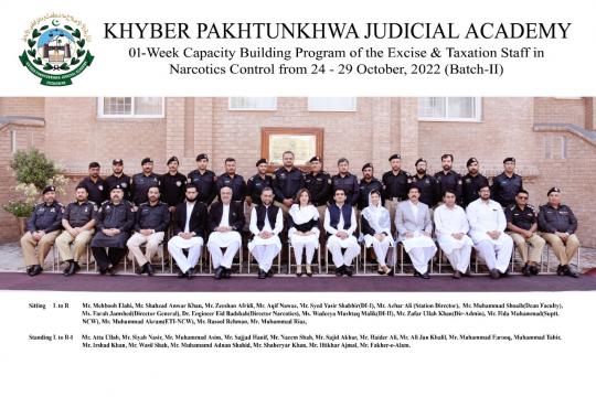 The Khyber Pakhtunkhwa Judicial Academy (KPJA) organized "One week training for Capacity Building of the Excise & Taxation Staff in Narcotics Control” from 24th to 29th October, 2022. The training was arranged for the second batch of officers of Narcotic Control Wing of the Excise, Taxation and Narcotics Control Department, Government of Khyber Pakhtunkhwa.