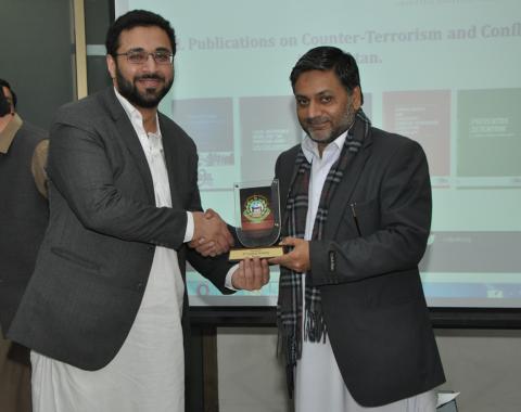 DG KPJA Dr Khurshid Iqbal presenting shield to Mr Muhammad Oves Anwar Director Conflict Law Centre, RSIL