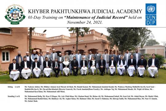 The Khyber Pakhtunkhwa Judicial Academy in collaboration with United Nations Development Program (UNDP) conducted the fifth 01-day training on “Maintenance of Record” today on 24th November 2021. The course participants were the District & Sessions Judges/ nominees, Senior Civil Judges (Judicial), Muharrars, Record Keepers, and In-charge of Copying Agency from the Districts Swat, Malakand, Tank, Shangla and Dir Lower. The modules were designed to sensitize the participants about the Preparation and Maintenance of Judicial Records, Custody and Transmission of Judicial Records, and Preservation of essential record and weeding out of unnecessary Record. The training commenced with the inaugural ceremony chaired by Mr. Zia-ud-Din Khattak, Director General, Khyber Pakhtunkhwa Judicial Academy. Mr. Ashfaq Taj District & Sessions Judge, Peshawar, and Mr. Ahmed Iftikhar District & Sessions Judge, Khyber delivered lectures on relevant topics. The training concluded with ceremony presided over by Ms. Farah Jamshed, Dean Faculty. The class representative shared his views and appreciated the efforts of the Academy. Mr. Ahmed Iftikhar District & Sessions Judge, and Faculty Members were also present. In the end, the certificates were awarded to the participants.