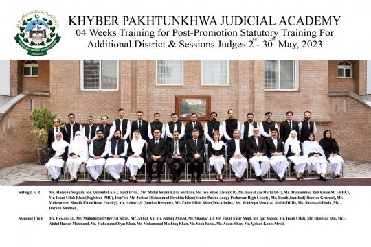 Four Weeks Post-Promotion Statutory Training for Additional District & Sessions Judges/Izafi Zilla Qazis concluded formally at Khyber Pakhtunkhwa Judicial Academy (KPJA) on May 30, 2023. Mr. Justice Muhammad Ibrahim Khan, Hon’ble Senior Puisne Judge, Peshawar High Court and Vice Chairman the Board of Governors KPJA, honored the occasion as a chief guest. The Registrar and Member Inspection Team, of the High Court also accompanied him. The Director General KPJA, Dean Faculty and all Directors were present at the occasion.