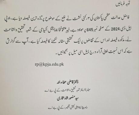 The Research Wing of the Khyber Pakhtunkhwa Judicial Academy intends to write a research article on “Khula’h” in view of the latest judgment of the august Supreme Court of Pakistan reported as “PLD 2024 Supreme Court 645”. The Research Wing desires to engage the respectable judges of the District Judiciary for getting their feedback. You all are, therefore, requested, to send your valuable feedback, suggestions and material relevant to the subject on rp@kpja.edu.pk. Stay tuned with the Research Wing for updates.