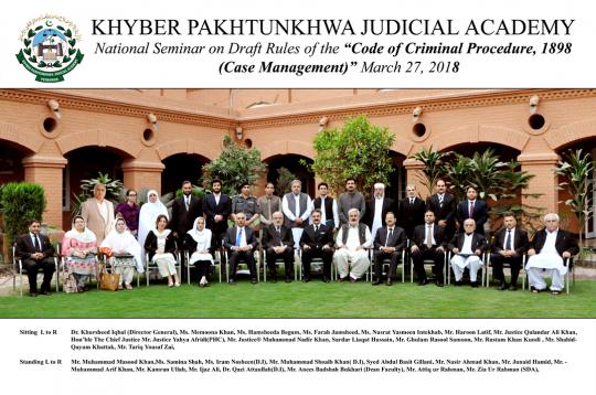 The Khyber Pakhtunkhwa Judicial Academy, in collaboration with Justice Sector Support Program, organized a daylong seminar on draft case management rule proposed in the Criminal Procedure Code, 1898.  The participants from cross section of the criminal justice actors (judges of the District Judiciary, prosecutors, lawyers, police, prison, probation, criminal justice sector donors) participated in the seminar. Delegates from outside the KP included the Registrar of the Sind High Court, nominee of the Registrar of the Lahore High Court, Registrar, AJK High Court, and DG, Balochistan Judicial Academy. Peshawar High Court’s senior Puisne Judge, Mr. Justice Waqar Ahmad Seth, participated in first session and Mr. Justice Qalandar Ali Khan, participated in the afternoon session. Mr. Justice Yahya Afridi, Chief Justice Peshawar and Chairman of the KP Judicial Academy also graced the occasion and distributed certificates amongst the participants. Earlier, the DG, KP Judicial Academy welcomed the participants.