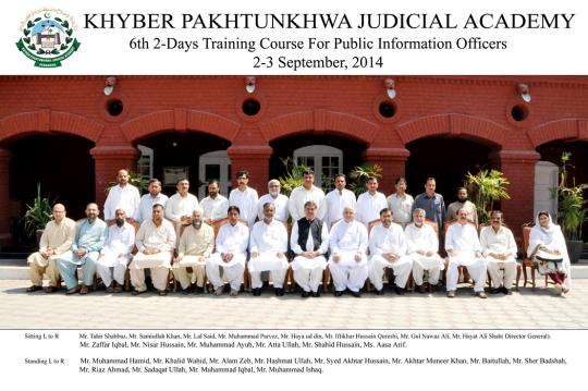 The KP Judicial Academy organized sixth session of 2-day (2-1 September, 2014) training for Public Information Officers (PIOs). The training was conducted on the request of the newly constituted Provincial Information Commission, KP. The PIOs are designated under the KP Right to Information Act, 2013. The batch consist of officers from Home Department including Police and Public Safety Commission)