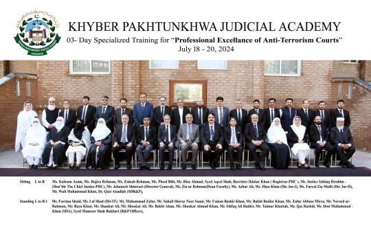 The Khyber Pakhtunkhwa Judicial Academy (KPJA) is conducting “Specialized Training on Professional Excellence of Anti-Terrorism Courts” from 18th to 20th July, 2024. The theme of the activity is “Factors Impacting Performance of Anti-Terrorism Courts”. Thirty participants including Judges of Anti-Terrorism Courts, Sessions Judges, Prosecutors & Investigators from all over the province are taking part in the activity.
