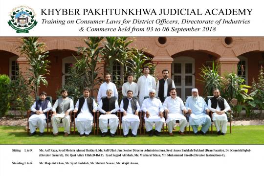 The Training of District Officers from Directorate of Industries & Commerce Khyber Pakhtunkhwa concluded in KP Judicial Academy on 6th September 2018. This was a four day training which will mainly focus on various related issues like Implementation of Consumer Protection Act 1997 (amended 2017), Office Management/Administration and Accounts/ Budget. The participants of the training include District Officers from Abbottabad, Charsadda, Haripur, Peshawar, Swabi, and Swat. The resource persons from different departments hold interactive sessions with the participants on the above mentioned topics. The concluding ceremony of the training held on 6th September. This training was conducted on the request of Directorate of Industries & Commerce KP Peshawar.
