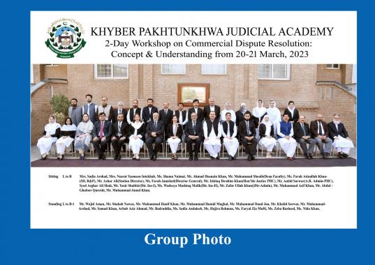 A two-day workshop was held on the "Commercial Disputes Resolution: Concept and Understanding" at Khyber Pakhtunkhwa Judicial Academy on 20 – 21 March, 2023. Judges of Commercial Courts, District Attorneys, Advocates, representatives from Sarhad and Khyber Chamber of Commerce and Government Officers of the Commerce, Industries and Technical Education Department were amongst the participants.