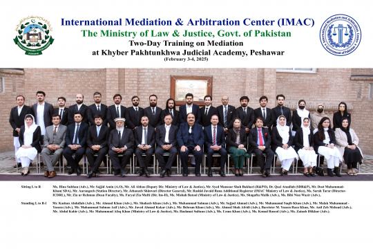 Peshawar, February 4, 2025 – On the directives of the Federal Minister for Law and Justice, the International Mediation and Arbitration Center (IMAC), Ministry of Law and Justice, successfully conducted a two-day training on Alternative Dispute Resolution (ADR) with a focus on Mediation at the Khyber Pakhtunkhwa Judicial Academy, Peshawar. Held on February 3-4, 2025, the training brought together legal professionals, and ADR experts to enhance their understanding and practical skills in Mediation.